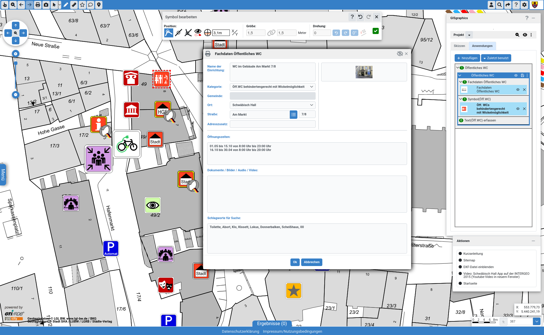 Mit dem Modul Bürgerinfo können interessante Orte in der Karte markiert und mit Fachdaten versehen werden. Dabei steht eine Vielzahl an unterschiedlichen Kategorien zur Auswahl bereit.